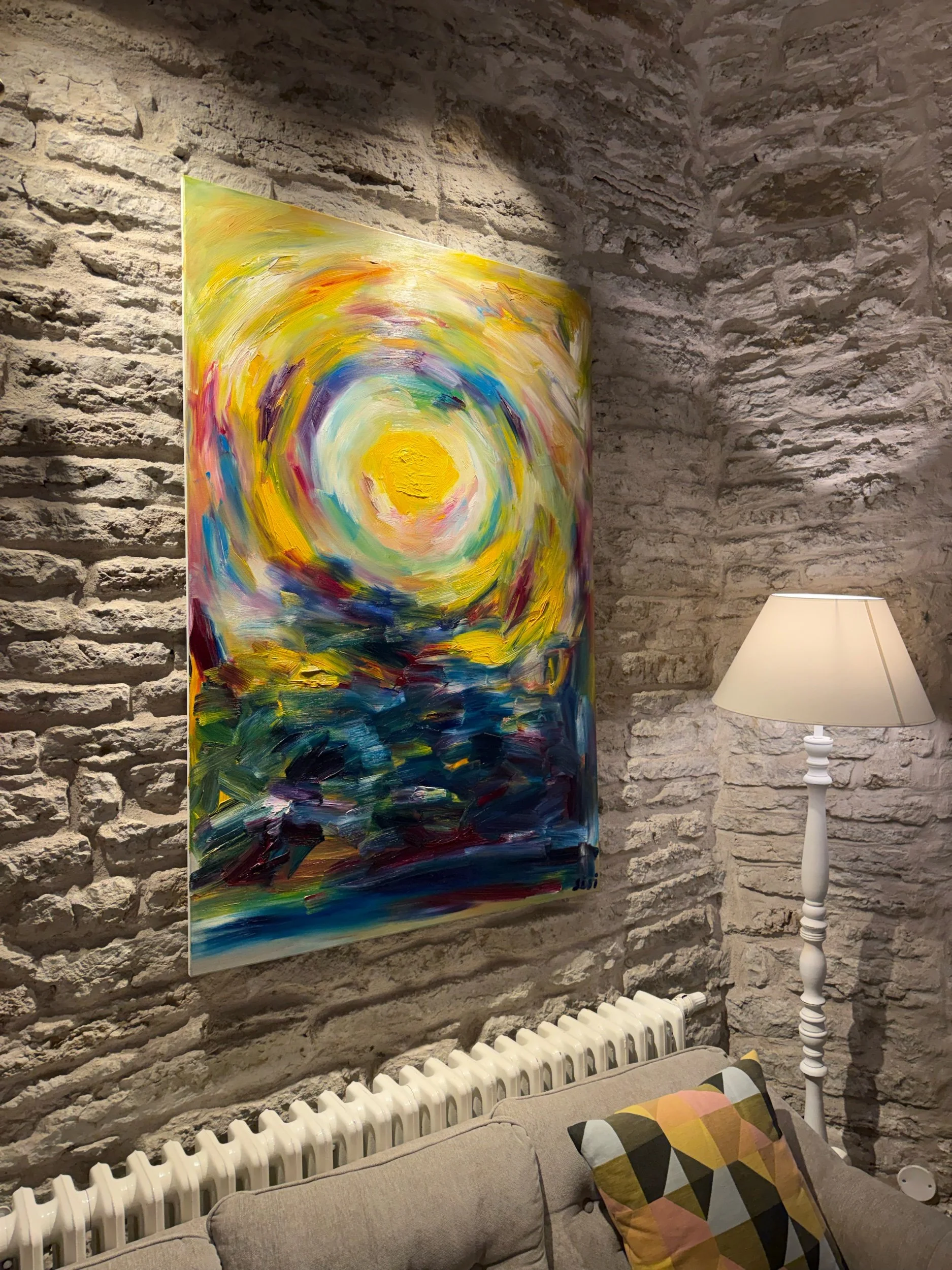 Painted mainly with hands and brushes in oil on linen, these original abstract oil paintings are created with trust in the importance of energy. Each artwork is an unfolding of the soul onto canvas — a responsibility the artist carries with devotion.